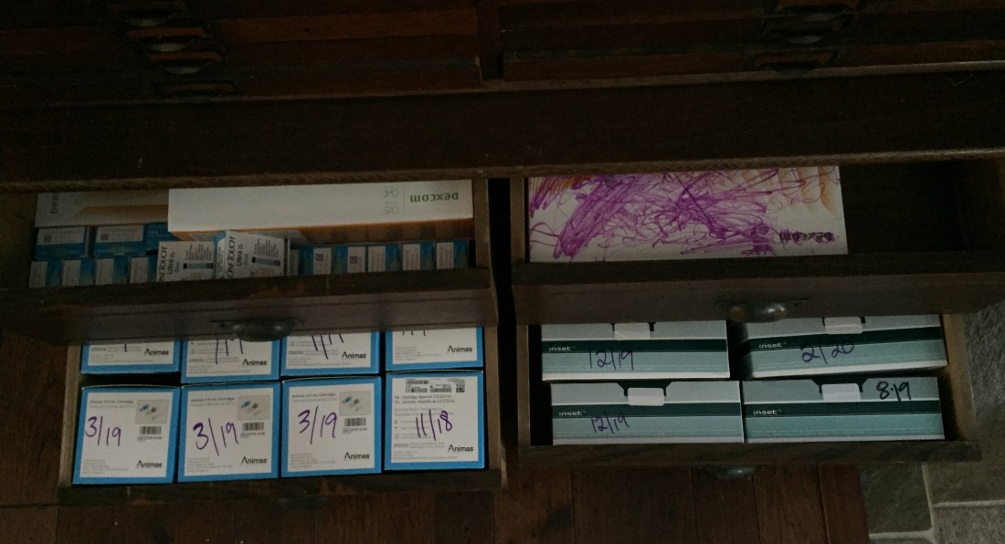 The things we store. You might store some keepsakes, maybe some fishing trophies, maybe some ceramic figurines, and probably definitely some food. You might store books, or maybe your grandmother’s hand embroidered napkins, or your father’s woodworking tools. We T1Ds store supplies, some of them sharp and needle like, some of them not, some liquids, and all of them necessary. So what on earth does T1D have to do with storage? A lot actually! You see quite a few of us receive our prescriptions from medical supply companies and they come in a 90 day supply. Which all means BOXES, boxes of test strips, boxes of infusion sets, boxes of reservoirs, boxes of iv pre pads boxes of batteries, boxes of alcohol pads, and boxes of CGM sensors. Where do we put all of those boxes? There is a joke in the T1D community about their “diabetes cupboard”. Yes folks this takes up at least a whole cupboard, or a cabinet stand, or set of drawers. In addition to all the supplies, we also have to store our insulin in the fridge. Again some of us get 3 month supply, and if we loose power, you guessed we are SOL. Again a reminder, if insulin is refrigerated it is fine for over a year or the expiration date, but once it is room temperature it is only good for 30 days AND cannot be refrigerated again because if it is it will kill the insulin and therefore not work at all. So a lot of us store generators… just for our fridges. With that insulin we all need syringes for back up, just incase our pumps weren’t working and we need to do a manual injection. For those T1Ds that don’t use pumps, they usually use insulin pens, which need refrigeration and pen tips, which are little syringe tips that screw on to the tip of the pens. These usually come in a box of 100. We also store extra lancets for our glucose meter, and also an extra glucose meter or 5. If we have had more than one pump, we only get new ones every 4 years; we store those as back up pumps. Also, even though they are completely functional you can’t give them away… which is the most fucked up thing in the universe. Seriously, I have tried. So I have 3 old insulin pumps that work just fine just sitting in my house with a total of value of $20,000 but since I can’t give them to someone else to use, they are only valued as a back up pump. No I can’t sell them, because they are life saving medical equipment. Back to storage, we store extra charging cables and plugs for our pumps, CGM receivers, and last but not least we store all of our used needles and syringes, aka sharps. Why do we store our sharps? Well we don’t store them forever; we just can’t throw them away everyday because it is a HUGE liability and biohazard. If a garbage man was pricked by used needles, it would be a huge mess, plus a horrible day for the garbage man! So we have to store our sharps in a sharps container until it is full and we can dispose of it property. So yes I have a container of used needles in my house all of the time. Just so you get a concept of how many we go through. A T1D that used syringes or pens would go through around 7+ a day. Also we are supposed to change our lancets every time we check our BG.. or once a day… most of us are bad at that. We can’t throw the old lancets away because they are tiny needles. I change my infusion set every other day and that includes 2 needles, and a cannula that was in my body. Also the CGM is changed once a week or 10 days and that is a huge ass needle. Needles to say we store a lot of sharps. One more thing we get to store is paper work from our appointments and bills for our taxes or for reimbursement from the underinsured program if we are eligible. Yes! This.. is.. so.. much..stuff! So, if you get a nicely wrapped present packaged in an infusion set supply box this Christmas, you will understand why.